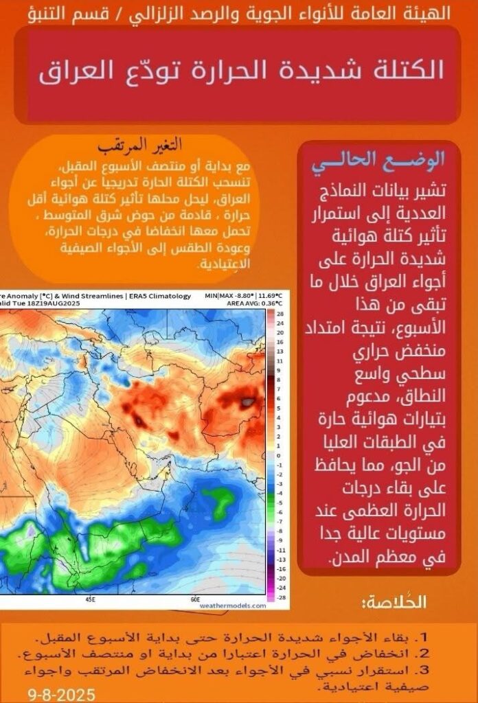 أعلنت الهيئة العامة للأنواء الجوية والرصد الزلزالي، اليوم السبت، أن الموجة الحارة التي تؤثر على أجواء العراق ستبدأ بالانحسار تدريجياً مع بداية أو منتصف الأسبوع المقبل.