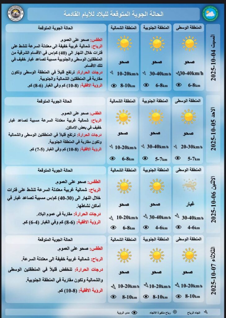 كما أشارت إلى أن الرياح ستكون شمالية غربية خفيفة إلى معتدلة السرعة (10 – 20 كم/س)، مع فترات من السكون في شمال وغرب المنطقة الوسطى، بينما تكون متقلبة الاتجاه وخفيفة في باقي المناطق.