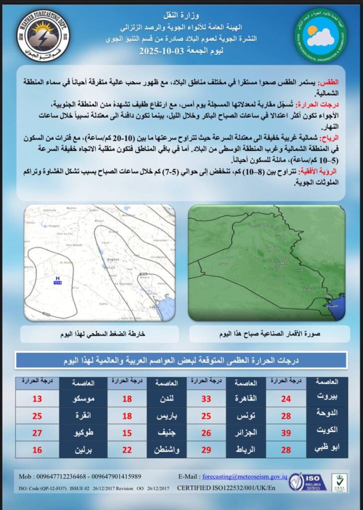 أعلنت الهيئة العامة للأنواء الجوية والرصد الزلزالي، اليوم الخميس، أن الطقس سيبقى مستقراً وصحواً في عموم مناطق البلاد، مع ظهور سحب عالية متفرقة أحياناً في أجواء المنطقة الشمالية.