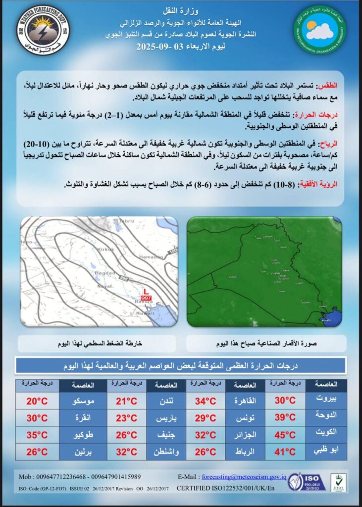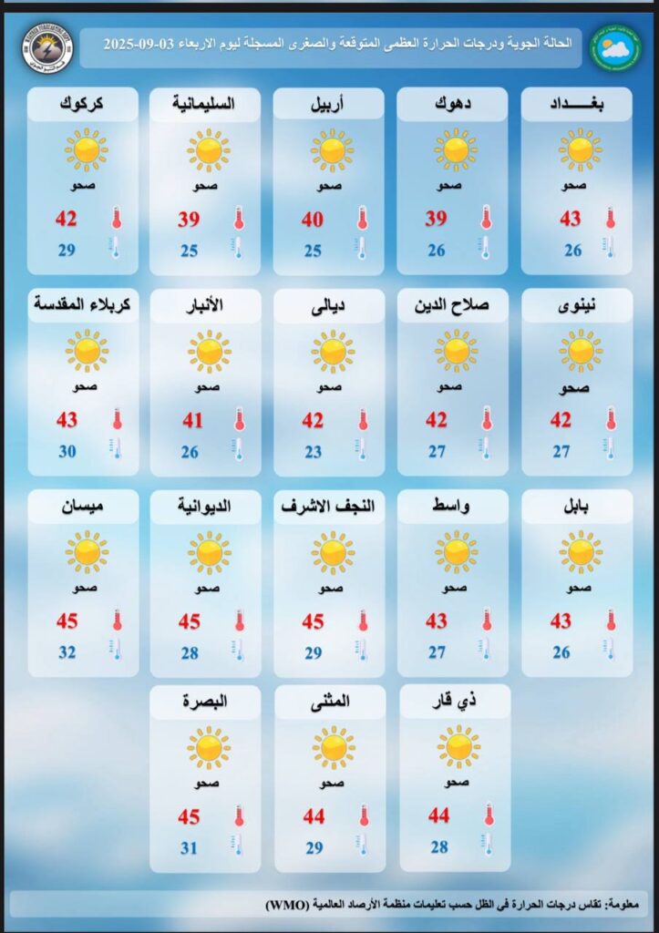 وسجلت العاصمة بغداد 26 درجة مئوية للصغرى و43 درجة للعظمى، فيما بلغت في البصرة 31 درجة صغرى و45 درجة عظمى.