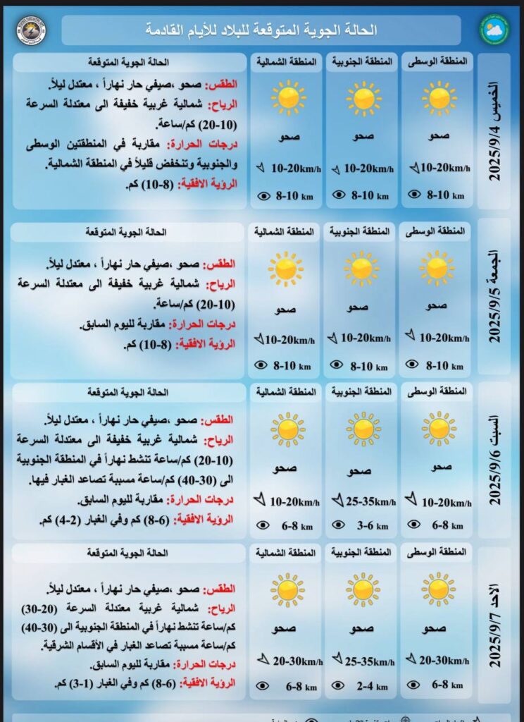 وأضافت أن الرياح في الوسط والجنوب ستكون شمالية غربية خفيفة إلى معتدلة السرعة، تراوح بين (10-20) كم/ ساعة، مع فترات من السكون ليلاً، في حين تكون الرياح في الشمال ساكنة صباحاً ثم تتحول تدريجياً إلى جنوبية غربية خفيفة إلى معتدلة.