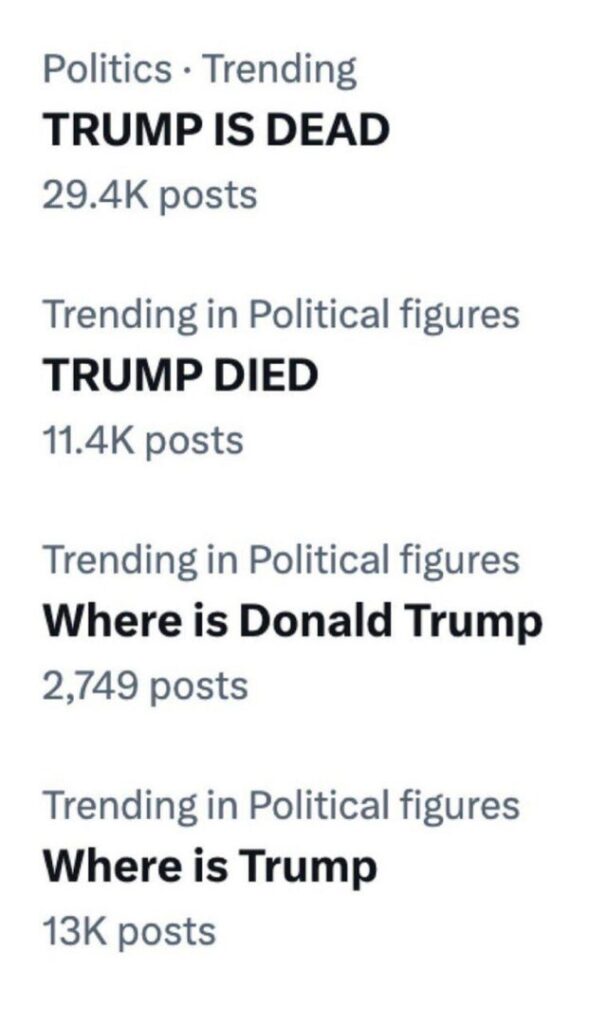 تصدرت شائعات حول وفاة الرئيس الأمريكي دونالد ترامب منصات التواصل الاجتماعي، بعدما غاب عن الظهور العلني لعدة أيام، فيما تصدّر وسم “ترامب-ميت” قائمة الأكثر تداولاً على منصة “إكس”.