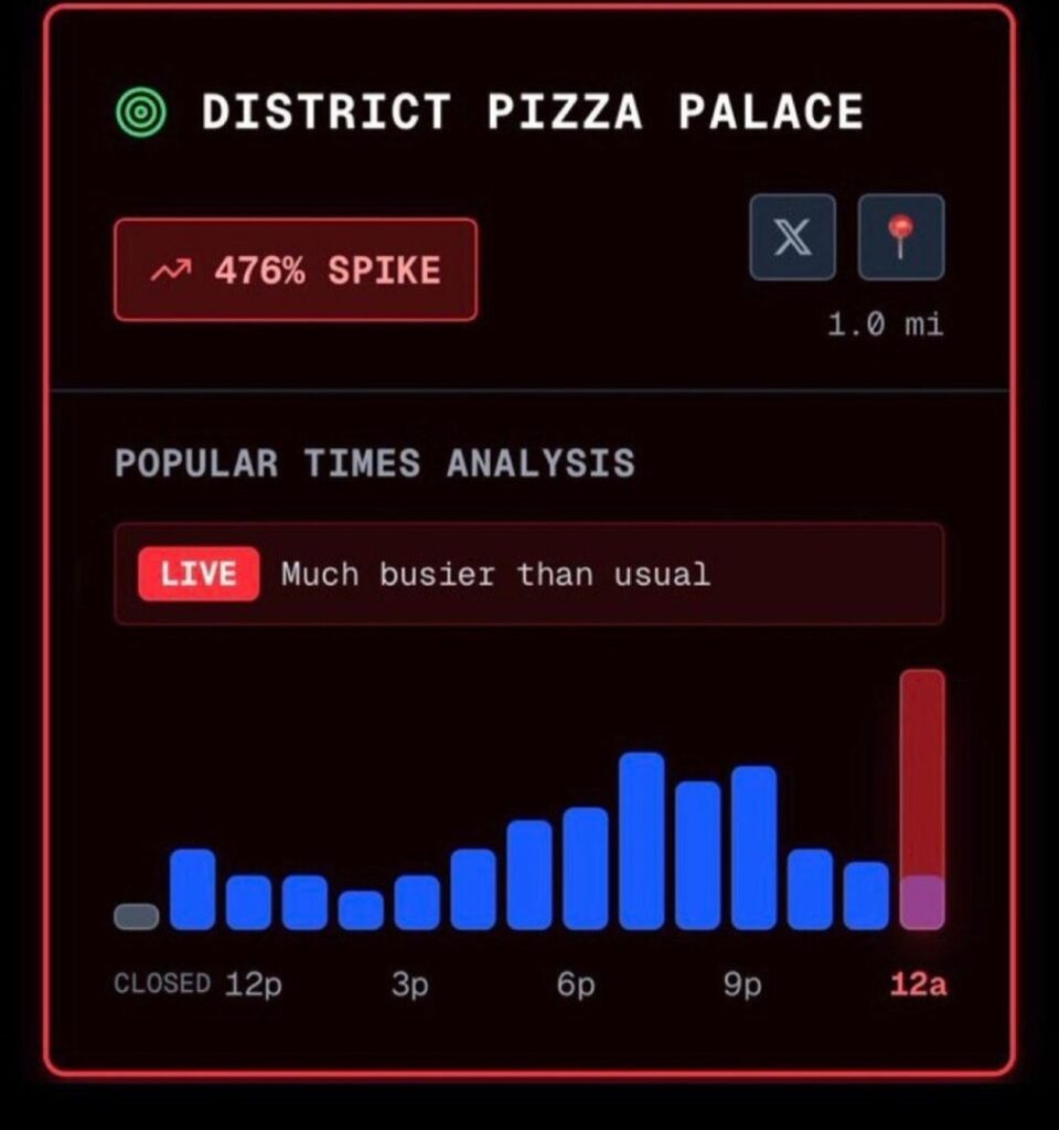 كما أُثيرت تكهنات إضافية بعد رصد ارتفاع غير اعتيادي في طلبات البيتزا بمحيط البيت الأبيض بنسبة 476%، اعتبرها البعض إشارة رمزية على وجود حالة طوارئ داخلية.