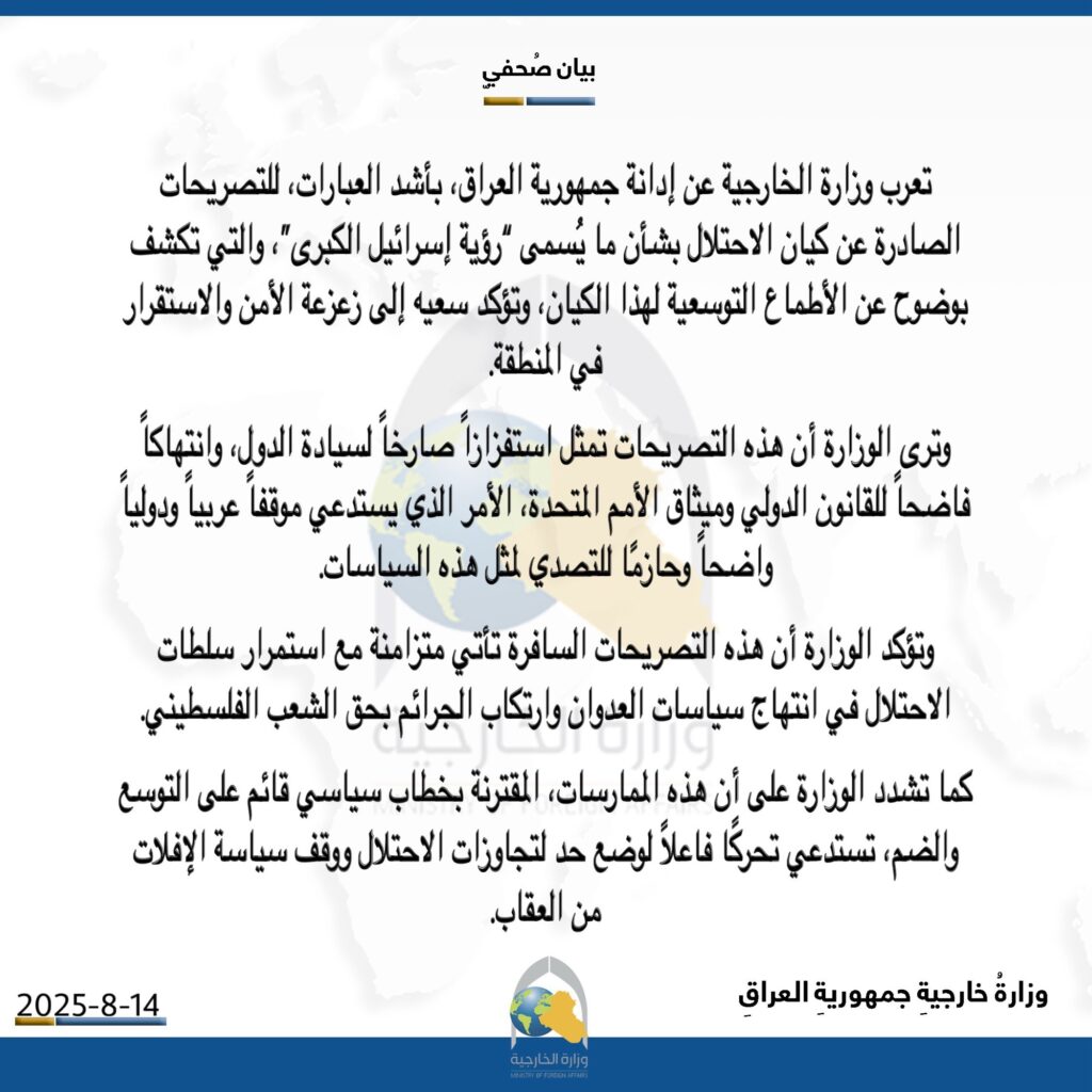 وقالت الوزارة في بيان تلقته أنباء نت، إنها “تعرب عن إدانة جمهورية العراق،للتصريحات الصادرة عن كيان الاحتلال بشأن ما يُسمى “رؤية إسرائيل الكبرى”، وترى أن هذه التصريحات تمثل استفزازاً صارخاً لسيادة الدول، وانتهاكاً فاضحاً للقانون الدولي وميثاق الأمم المتحدة، الأمر الذي يستدعي موقفاً عربياً ودولياً واضحاً وحازمًا للتصدي لمثل هذه السياسات”.