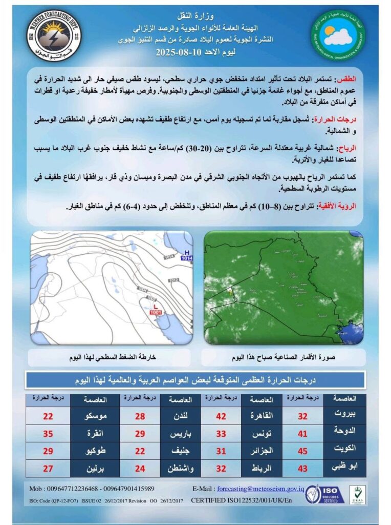 وذكرت الهيئة في نشرتها اليومية التي تلقتها ‏أنباء نت، أن درجات الحرارة ستكون قريبة من معدلات يوم أمس، مع تسجيل ارتفاع طفيف في بعض مناطق الوسط والشمال، فيما تهب رياح شمالية غربية معتدلة السرعة (20-30 كم/ساعة) ونشاط خفيف جنوب غربي البلاد يسبب تصاعد الغبار، بينما تستمر الرياح الجنوبية الشرقية في البصرة وميسان وذي قار، ما يرفع من معدلات الرطوبة السطحية.