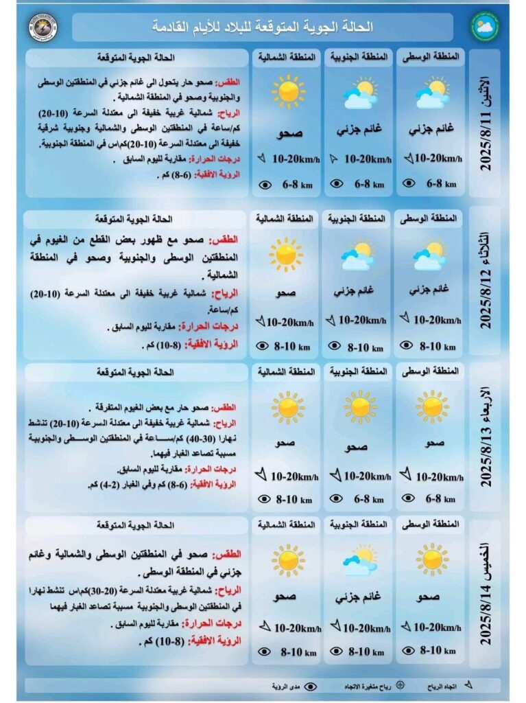 أعلنت الهيئة العامة للأنواء الجوية والرصد الزلزالي، اليوم الأحد، استمرار تأثر البلاد بامتداد منخفض جوي حراري سطحي، ما يبقي الأجواء صيفية حارة إلى شديدة الحرارة في عموم المناطق، مع ظهور غيوم جزئية في الوسطى والجنوبية، وفرص محدودة لهطول أمطار خفيفة أو قطرات رعدية متفرقة.