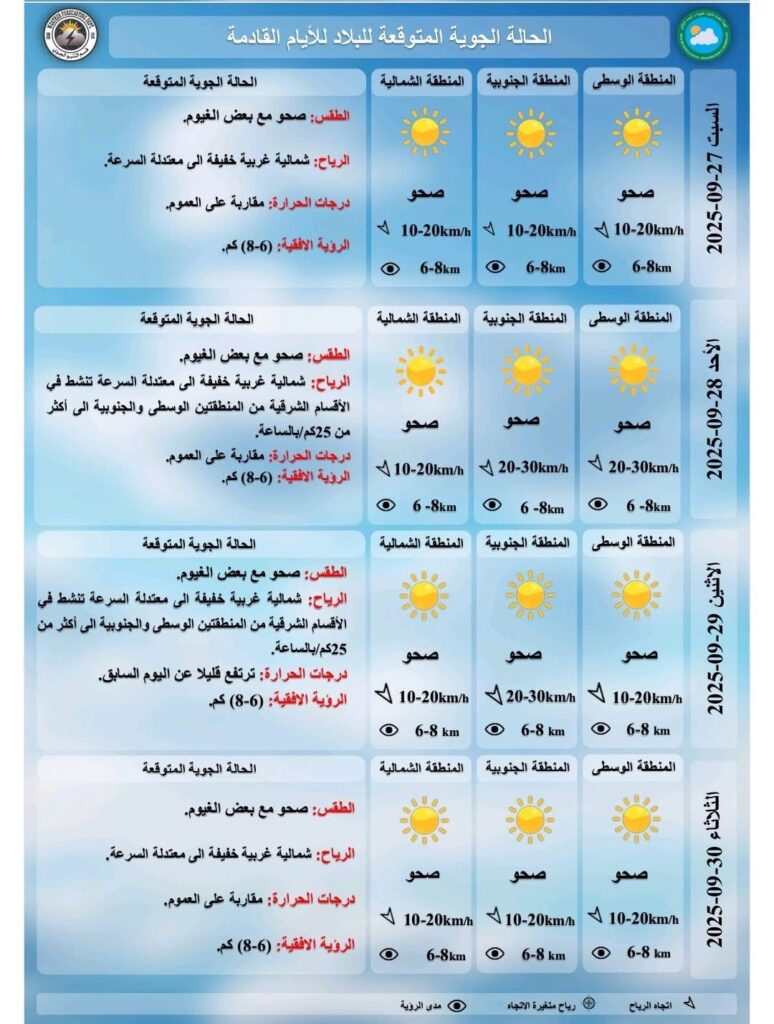 وأضافت النشرة أن الرياح ستكون غربية إلى شمالية غربية خفيفة إلى معتدلة السرعة تراوح بين (10–20) كم/ساعة، فيما تهب رياح جنوبية شرقية خفيفة أحياناً في الأقسام الشرقية والشمالية الشرقية. أما مدى الرؤية الأفقية فسيتراوح بين (8–10) كم، وقد يتراجع صباحاً بفعل الغشاوة والتلوث إلى (5–7) كم، قبل أن يتحسن تدريجياً خلال النهار.