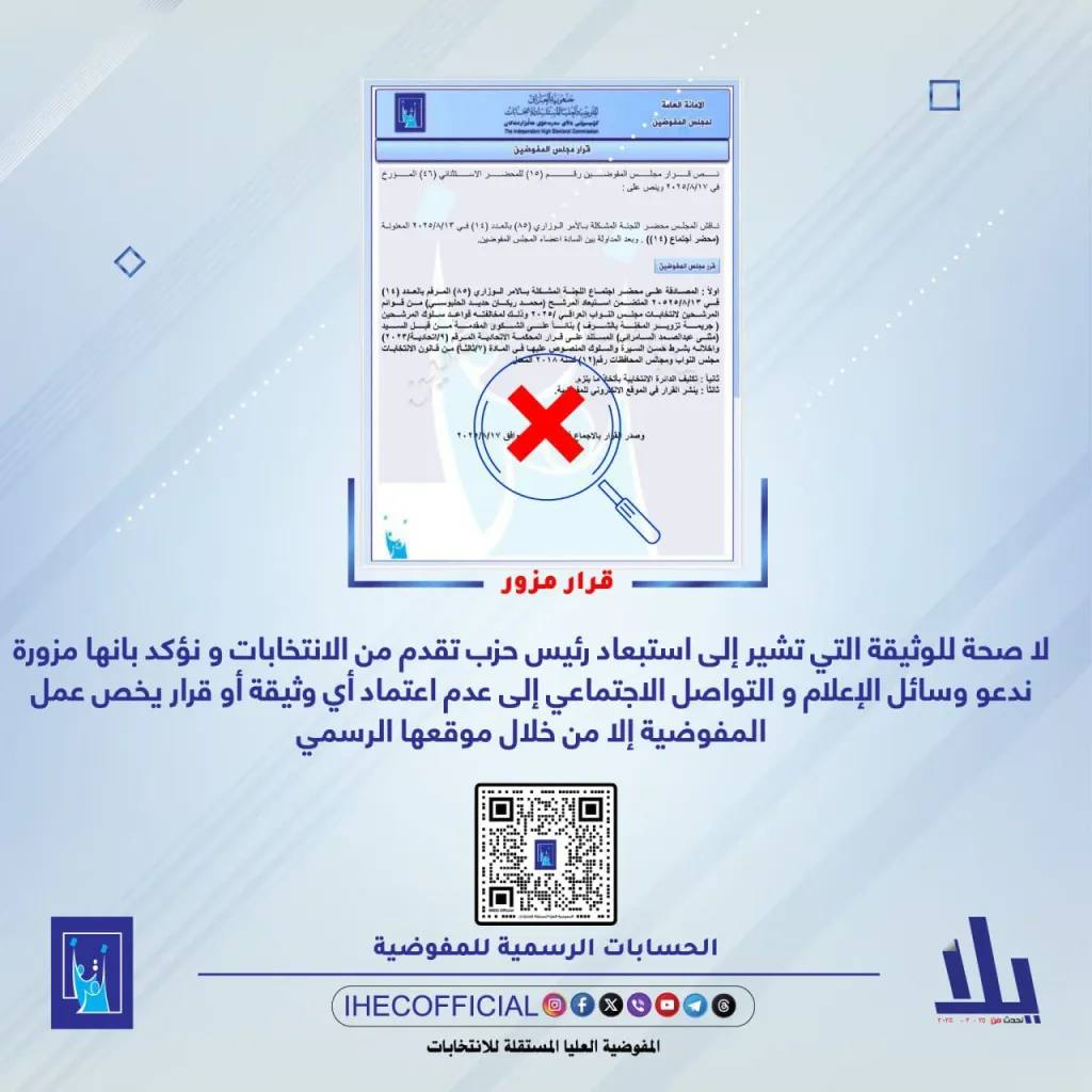 وأكدت المفوضية في بيان مقتضب تلقته أنباء نت أن الوثيقة “مزورة ولا أساس لها من الصحة”، داعية وسائل الإعلام والجمهور إلى اعتماد الأخبار والمستندات الخاصة بعملها حصراً عبر موقعها الرسمي.